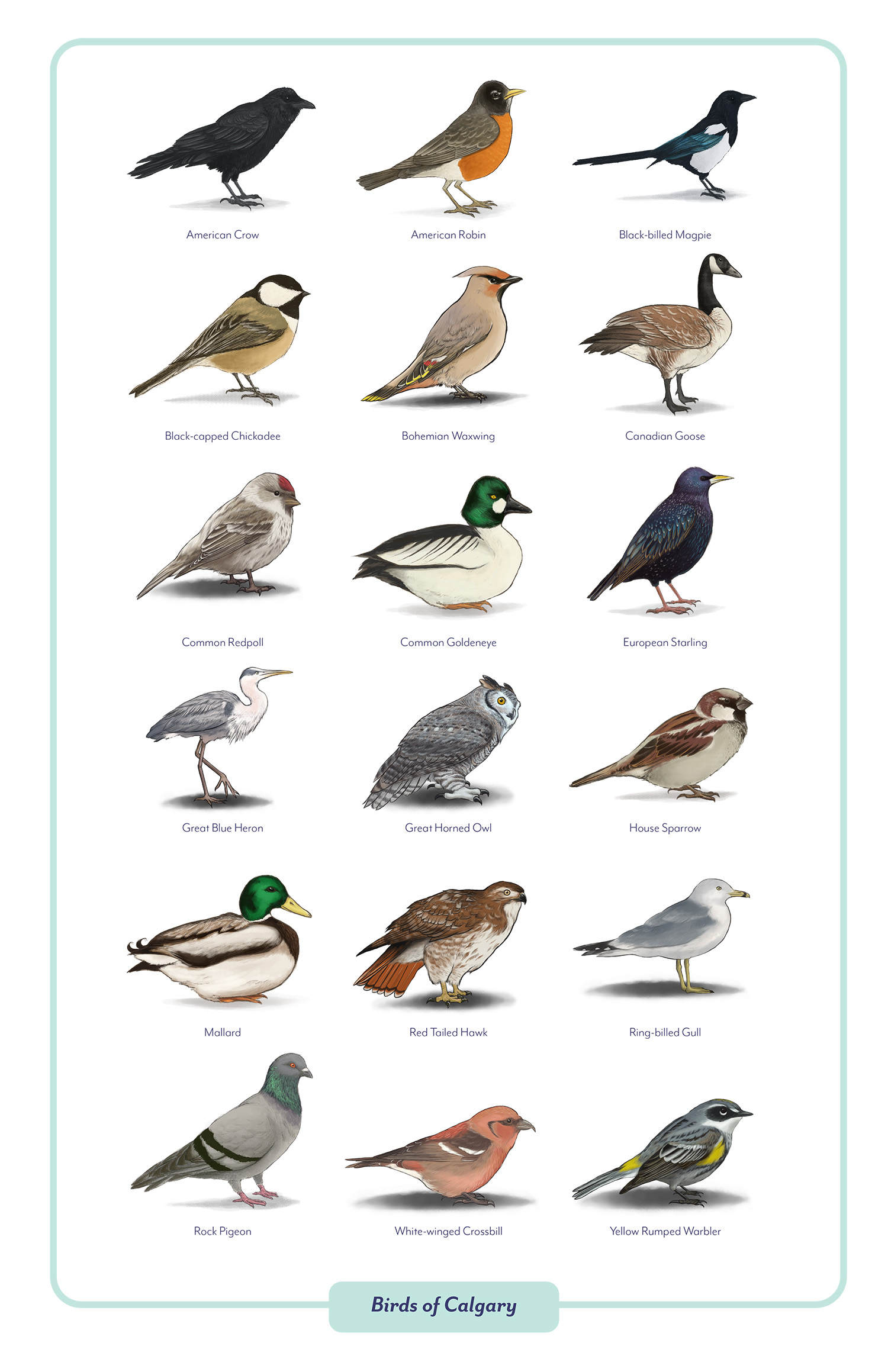 18 side-profile illustrations of the most common birds found in the city of Calgary. Painted in Photoshop.